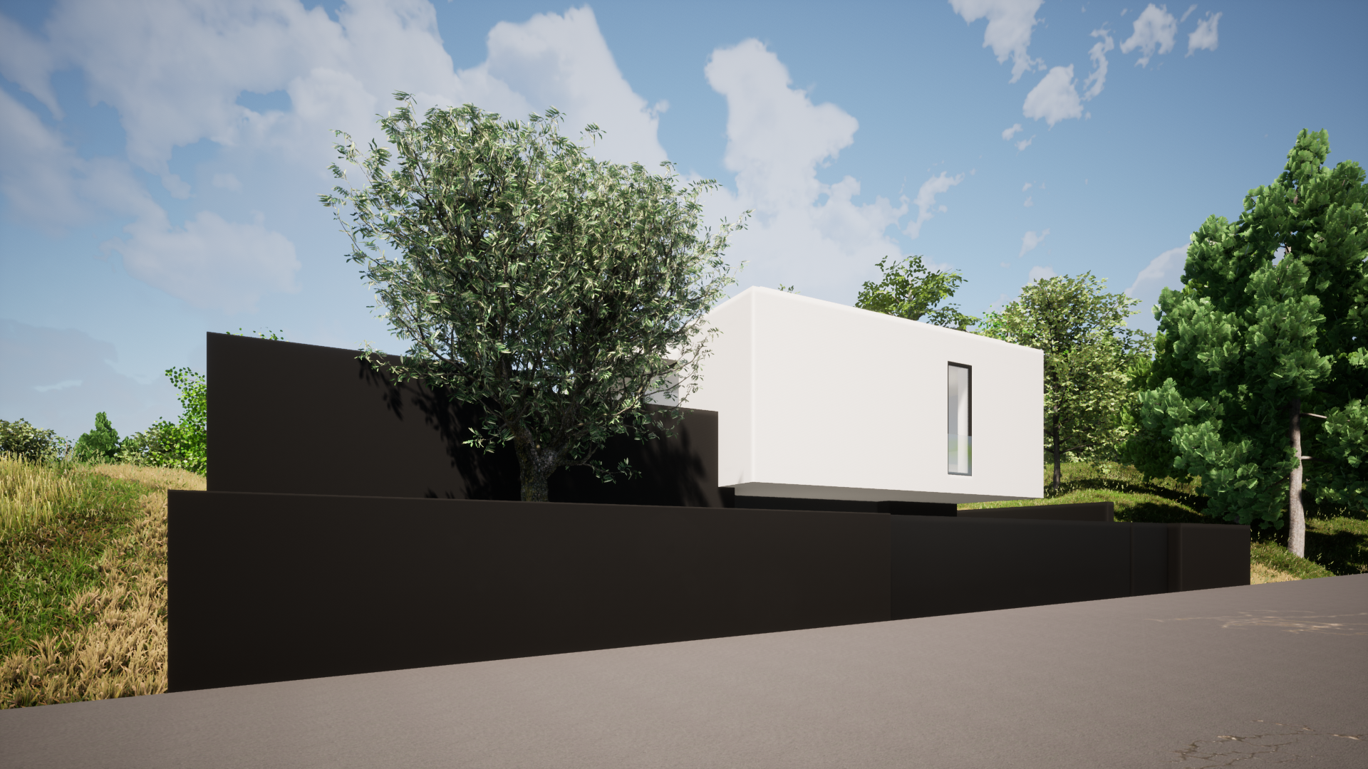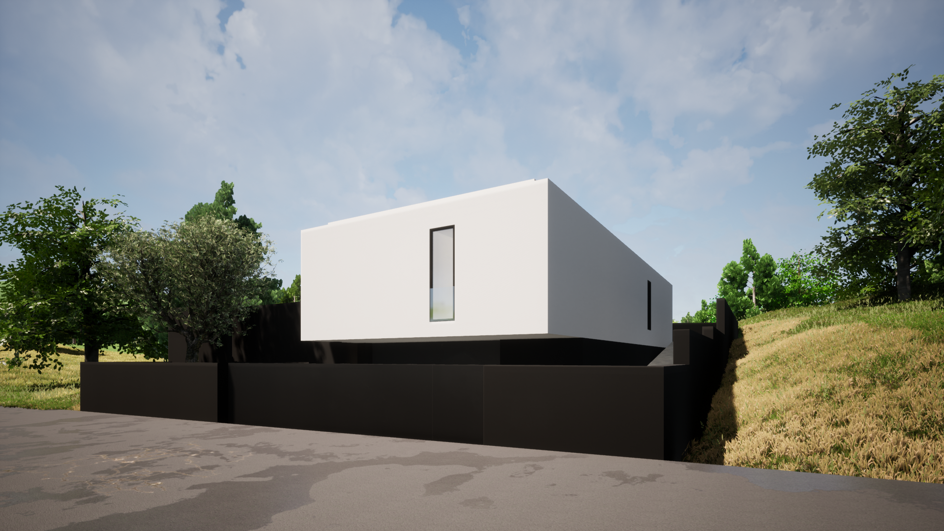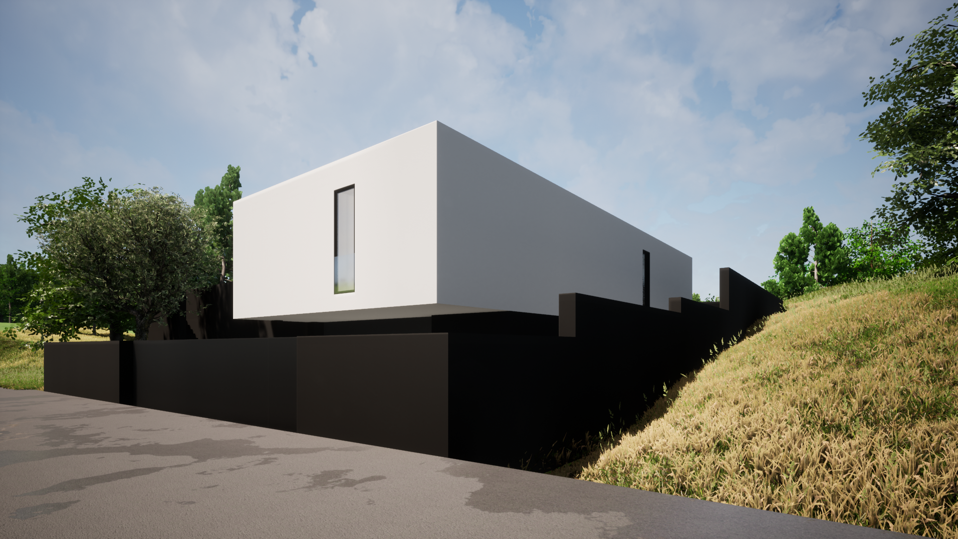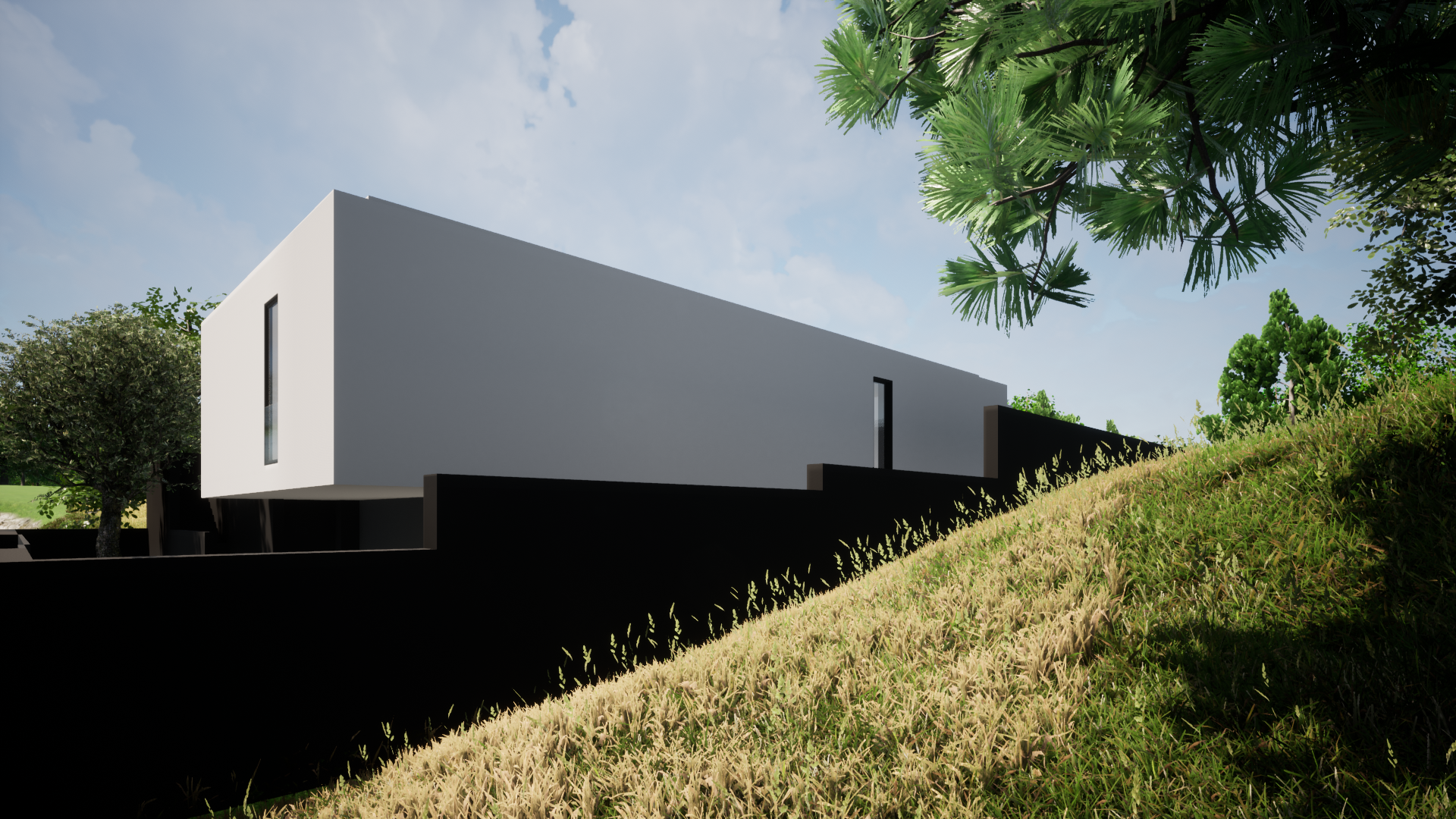 Esta casa implanta-se num terreno com ligeira inclinação, tendo uma exposição solar favorável. Insere-se numa zona rural perto da cidade, englobada num conjunto habitacional previsto em loteamento. Por estar inserida num loteamento obriga ao cumprimento de alguns parâmetros previamente estabelecidos, nomeadamente, a obrigatoriedade do piso 0 se destinar a uso de garagem e o piso 1 a uso habitacional. Isso tem influência direta na volumetria da edificação, que se divide em 2 pisos.