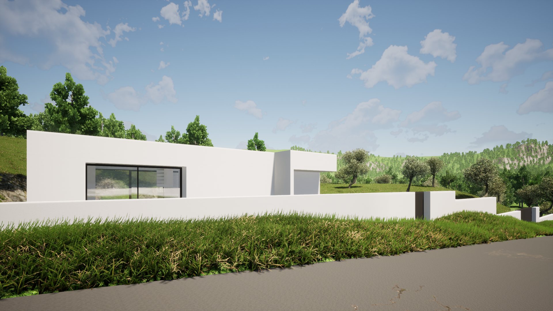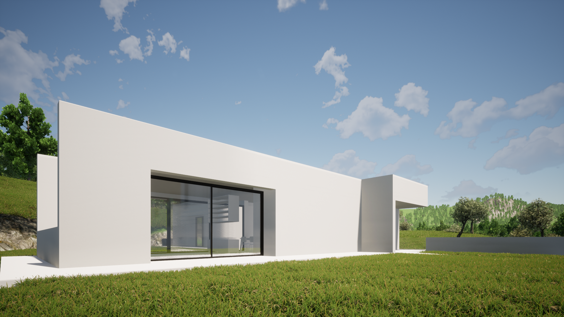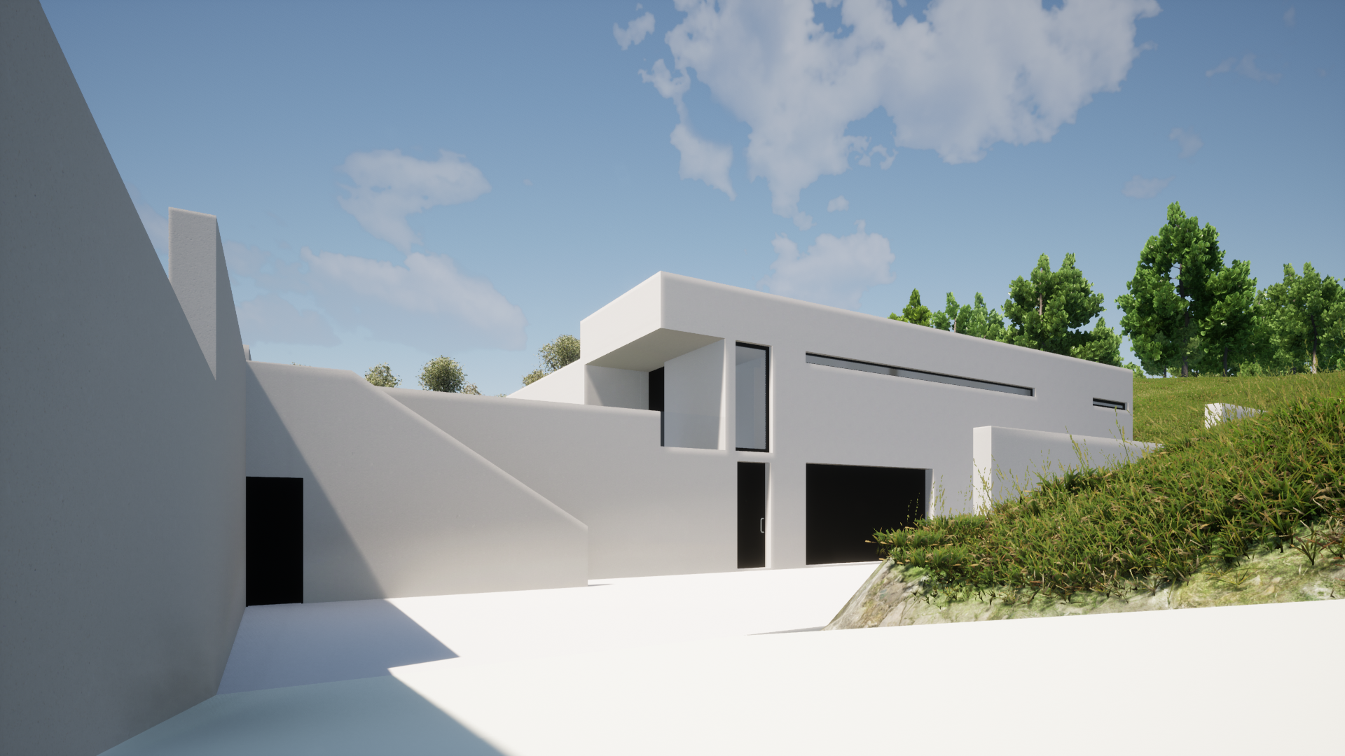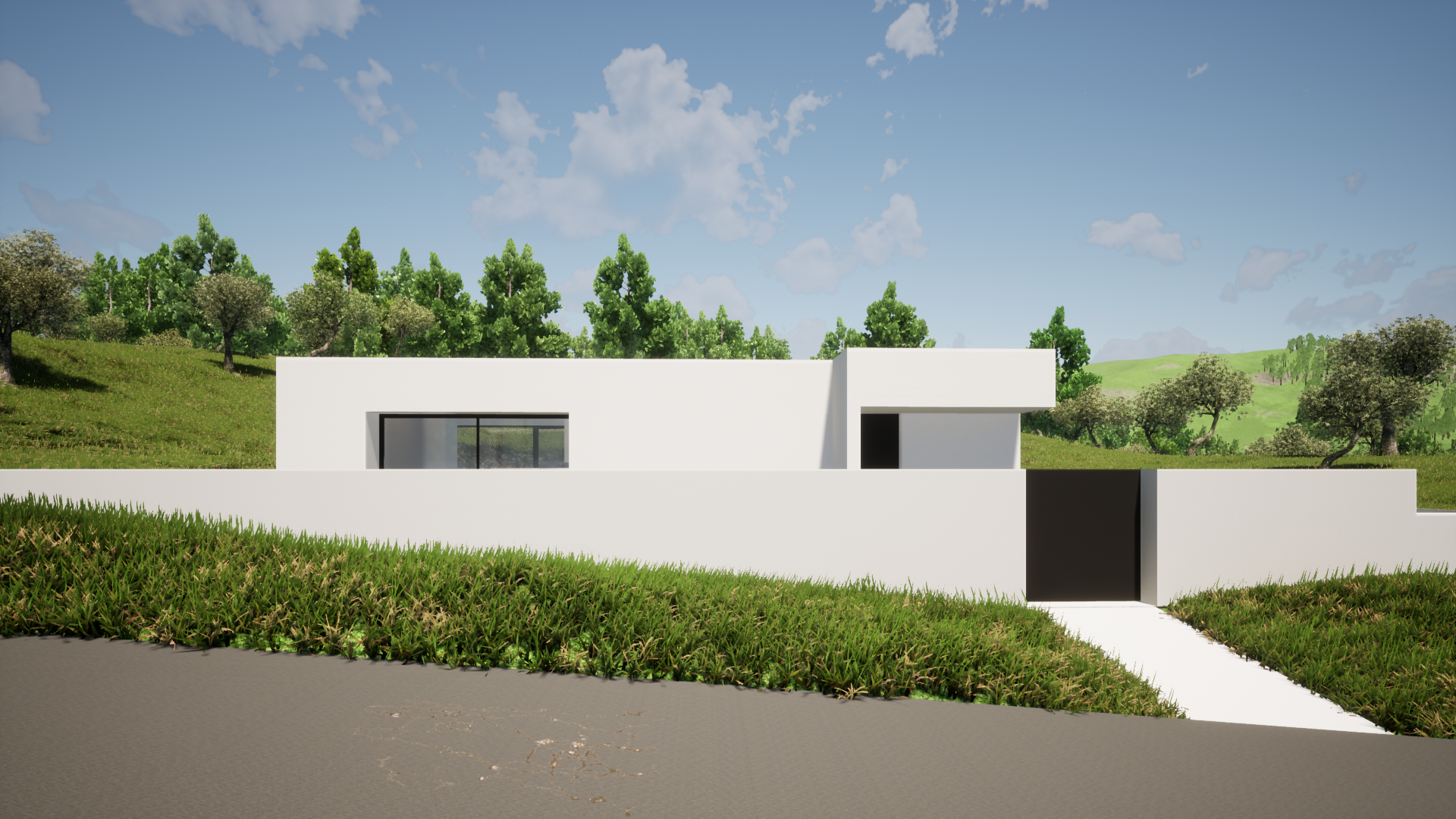 Esta casa implanta-se num terreno bastante amplo, apresentando ligeira inclinação. Como está isolada, tem uma excelente exposição solar. A forma da casa tenta adaptar-se ao terreno e ao seu desnível, desenvolvendo-se em 2 pisos e em forma de “L”, favorecendo a existência de um espaço exterior útil mais protegido e privado.