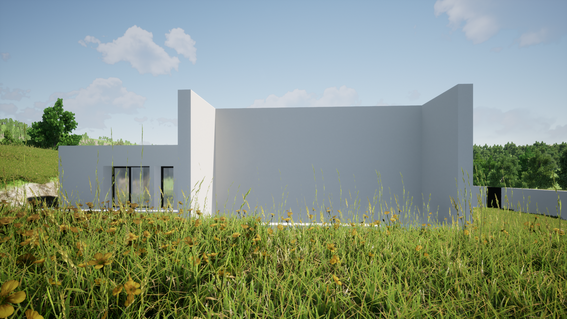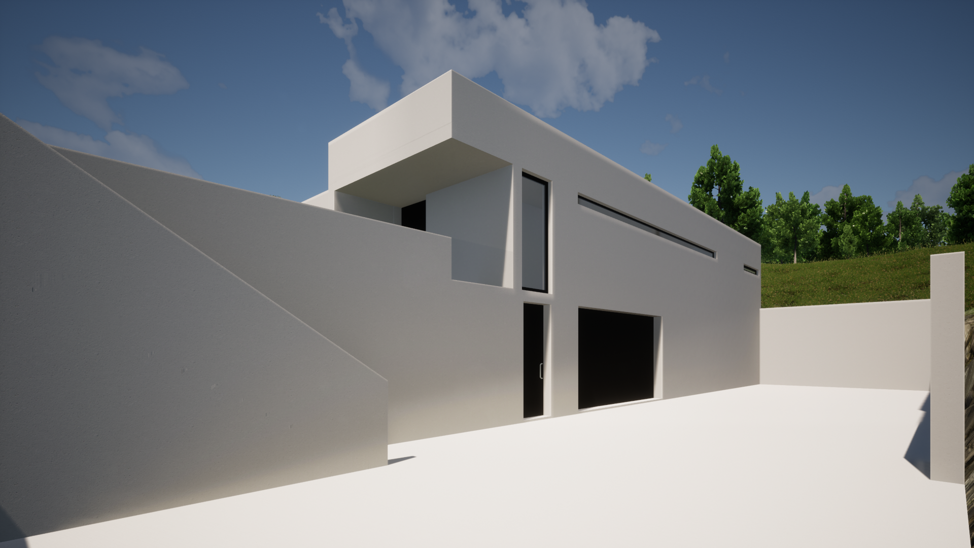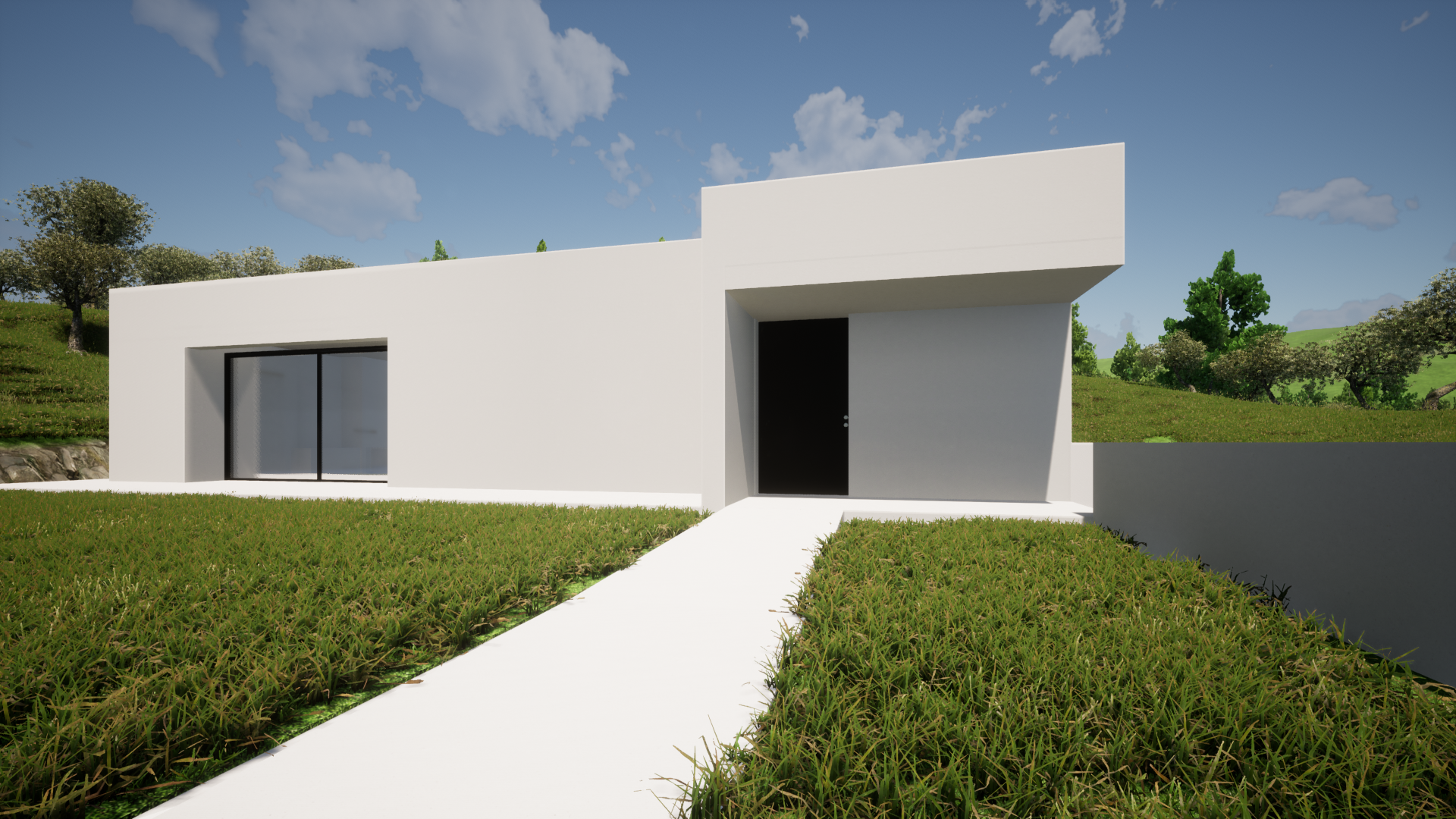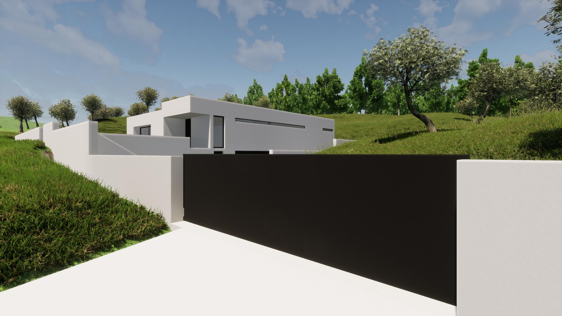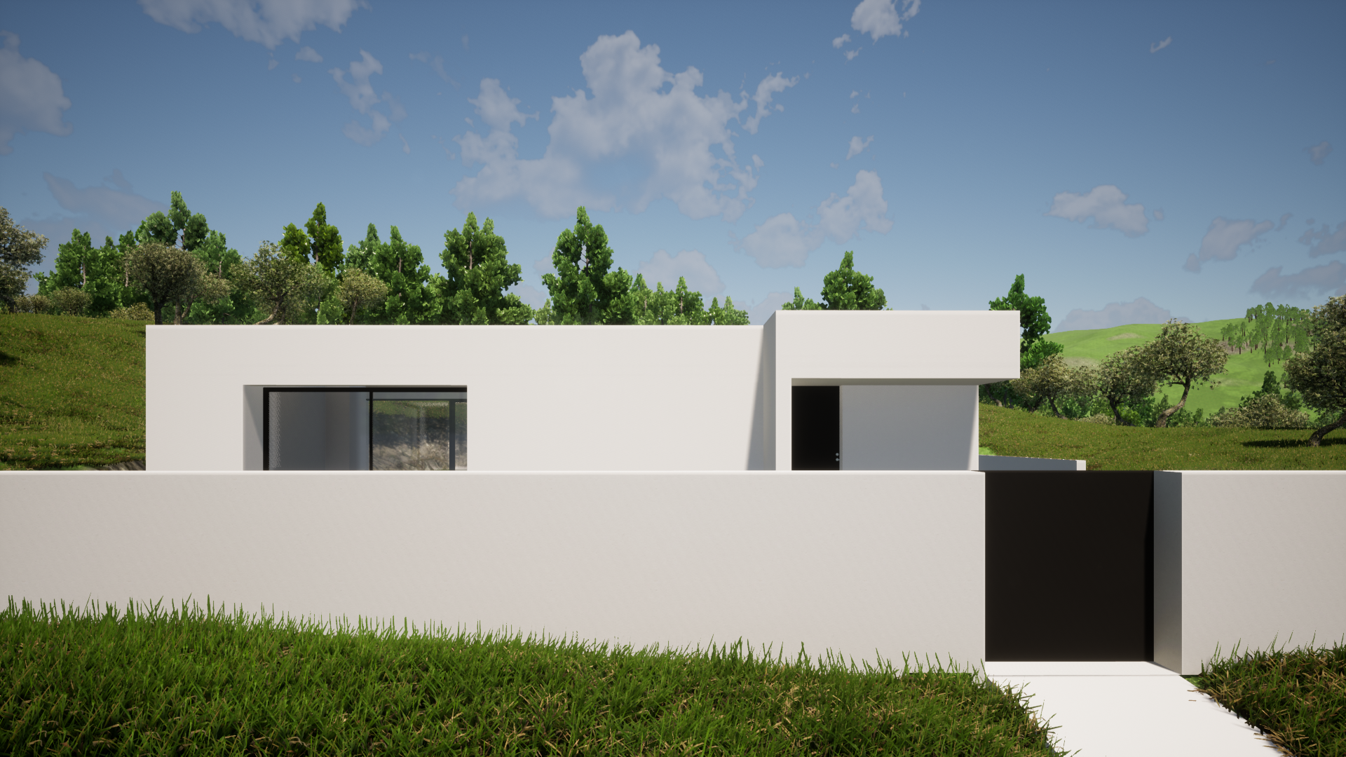 Esta casa implanta-se num terreno bastante amplo, apresentando ligeira inclinação. Como está isolada, tem uma excelente exposição solar. A forma da casa tenta adaptar-se ao terreno e ao seu desnível, desenvolvendo-se em 2 pisos e em forma de “L”, favorecendo a existência de um espaço exterior útil mais protegido e privado.