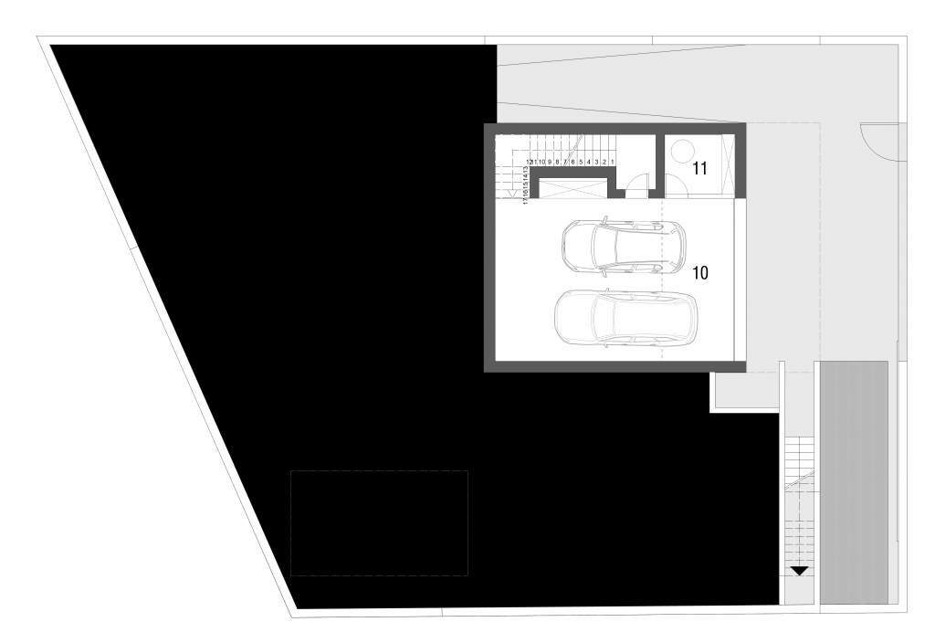 1 Entrada | 2 Sala de estar | 3 Sala de refeições | 4 Cozinha | 5 Quarto | 6 Instalação sanitária | 7 Closet | 8 Lavandaria | 9 Arrumos | 10 Garagem | 11 Área técnica