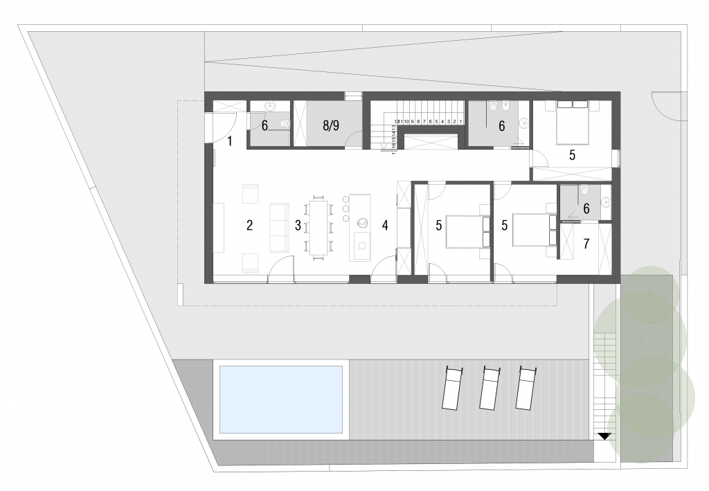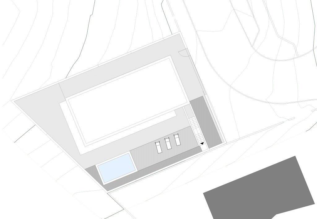 A forma da casa adapta-se ao declive do terreno e desenvolve-se a partir de uma base sólida. O volume tenta uma relação de equilíbrio com a escala da envolvente e com o lote, sendo compacto e simples, favorecendo a existência de espaço exterior útil.